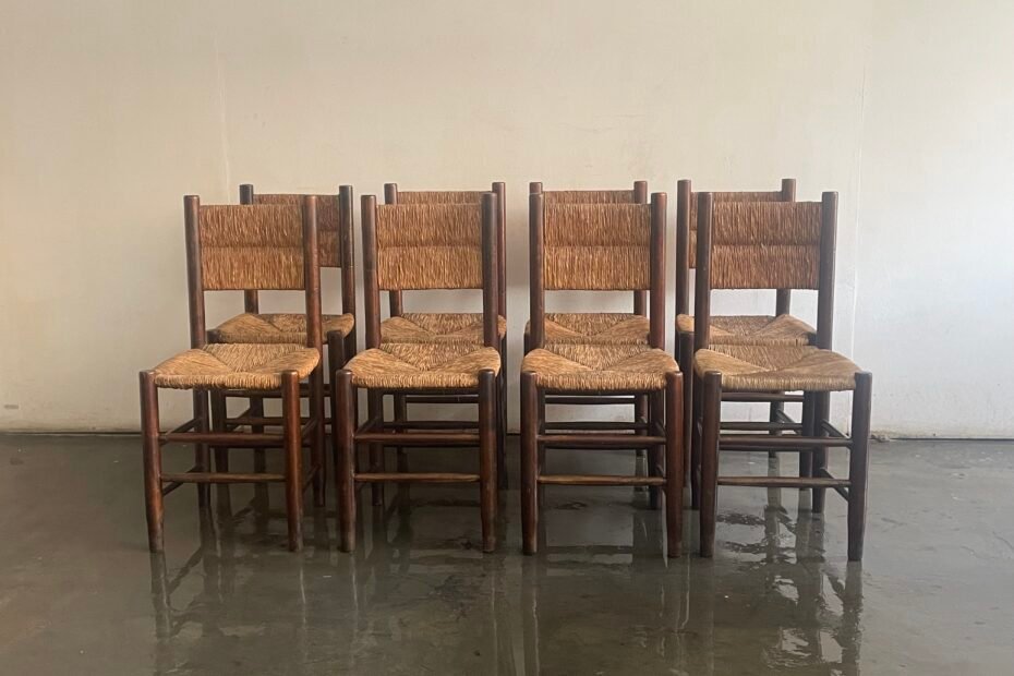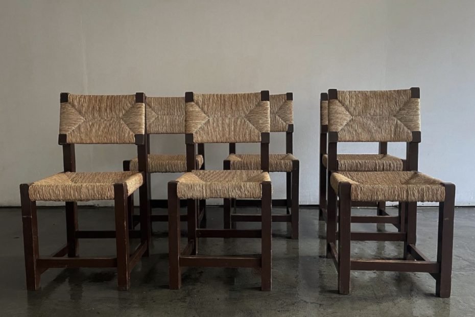 Spectacular set of 6 rationalist chairs, solid wood and bulrush, Spain 1960s. 41 x 41 x 81 H 900€