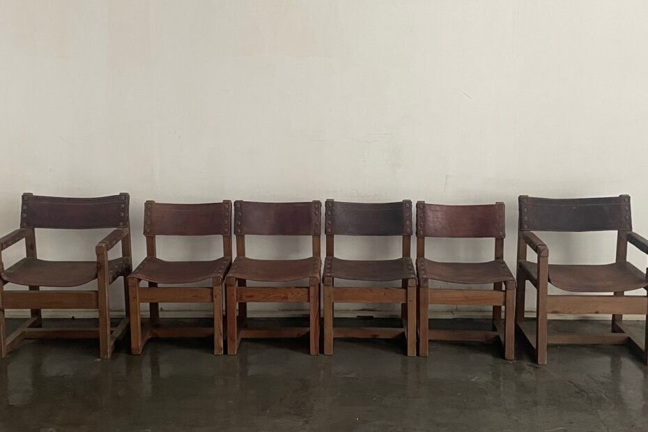 set of 6 biosca chears, good condition, solid pine wood and leather, Spain 1960s 73 x 66 x 91 H 1800€