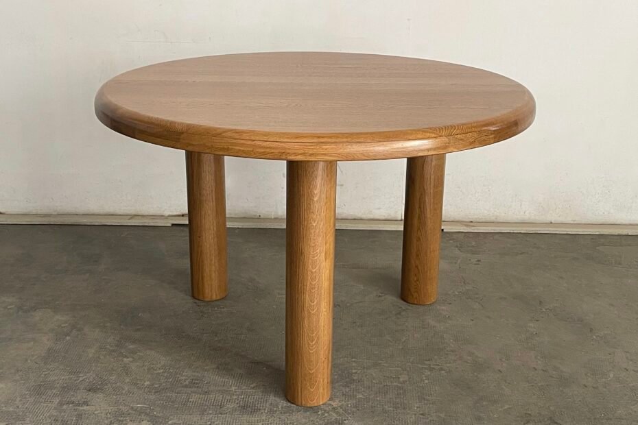 brutalist dining table, solid oak wood, round legs, Spain 1970s 120 D x 74 H 2200€
